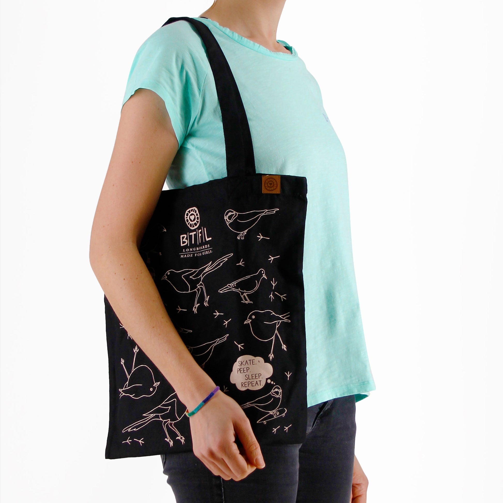 it can be combined with all looks. The thought bubble "skate, peep, sleep, repeat" adds a small and funny accent to your love of skateboards.