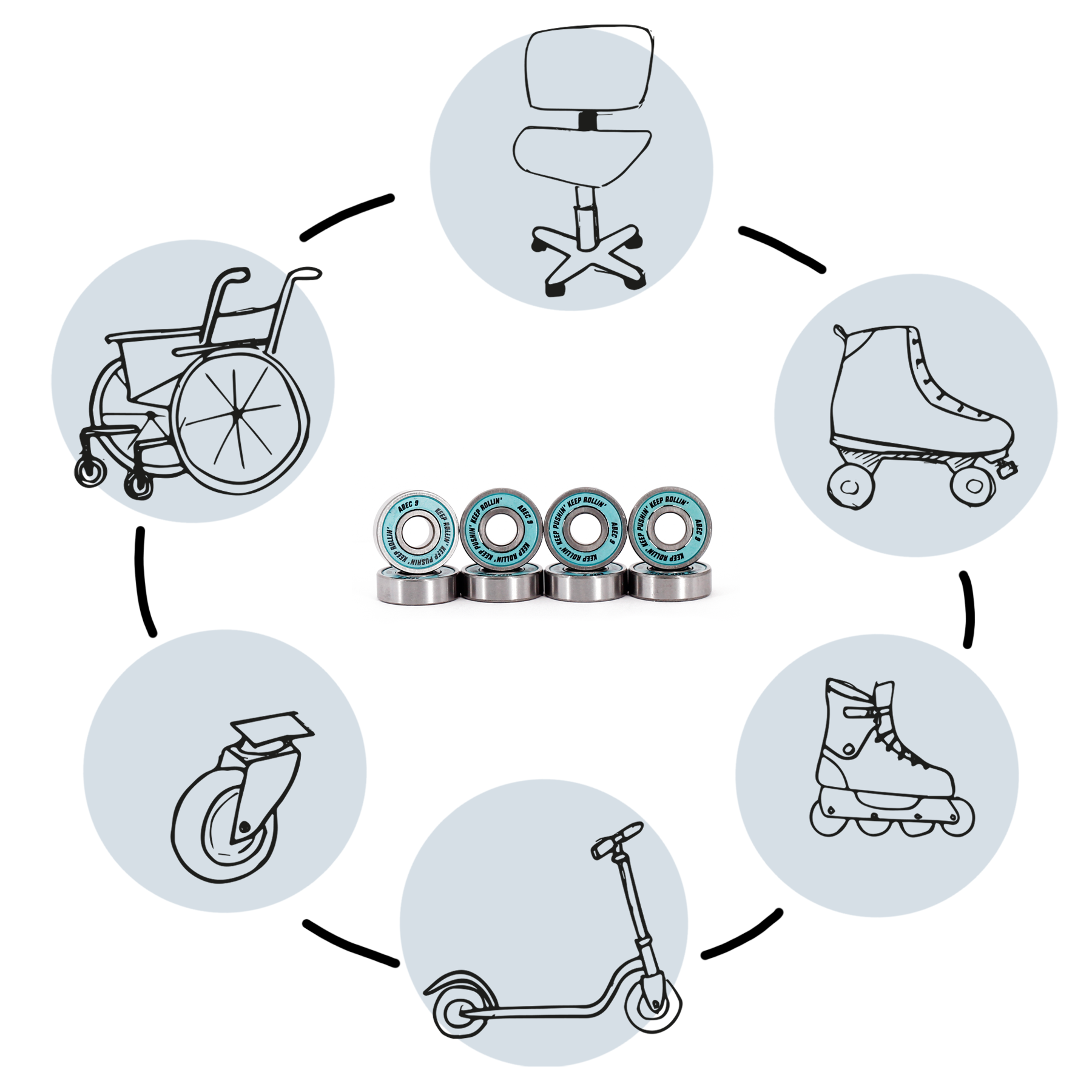 ABEC 9 ball bearings with chrome balls and turquoise resin shield on both sides. The shield can be removed and reattached to clean the ball bearings. The bearings are oiled with Japanese smooth running oil. One set contains 8 ball bearings.